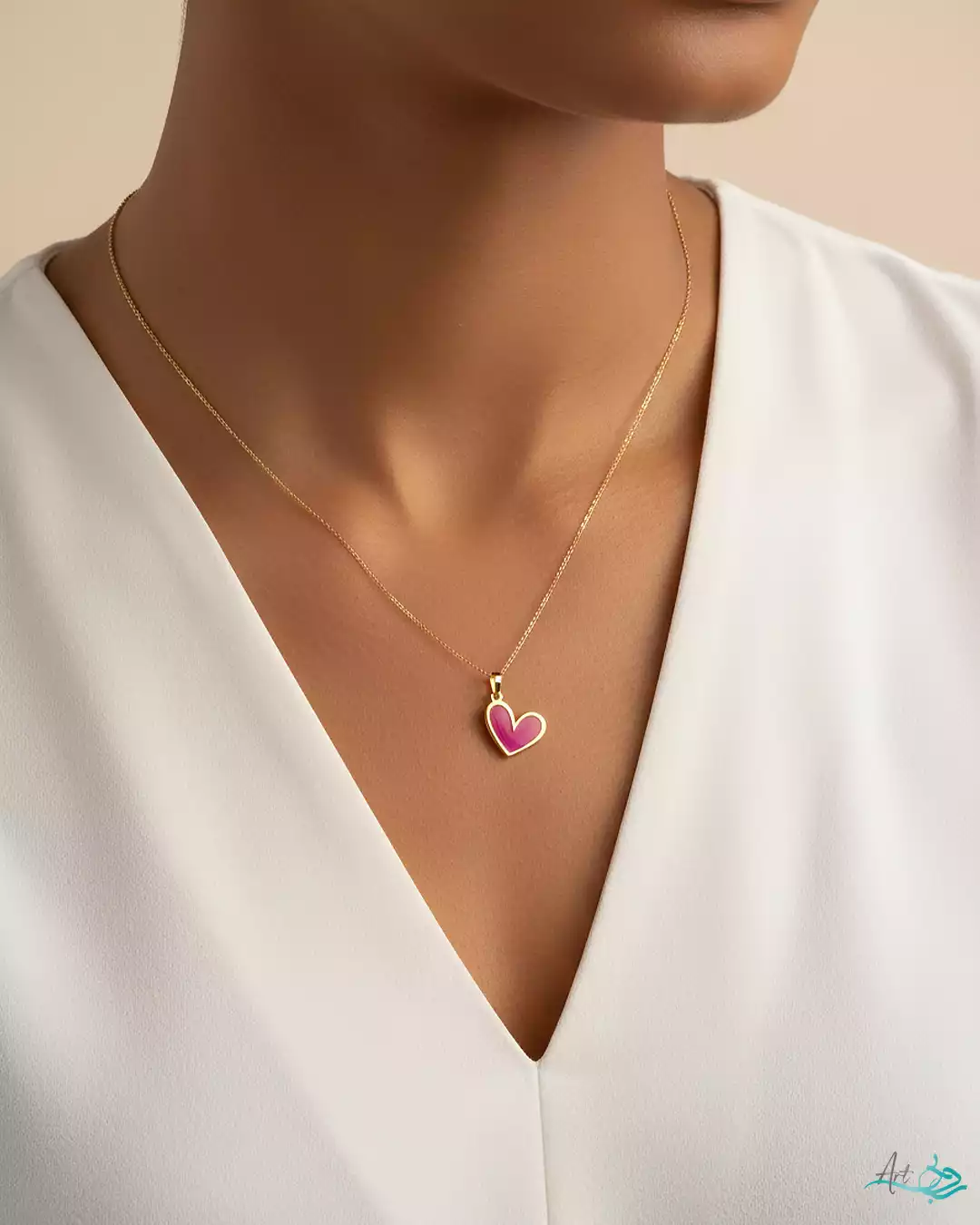 این محصول متشکل از طلای 18 عیار به همراه مینا کاری صورتی بنفش می باشد. طرح این محصول برگرفته از یکی از اشکال فانتزی ایموجی قلب است. این طرح از قلب نماد عشق و احساسی صمیمی و دوستانه است.