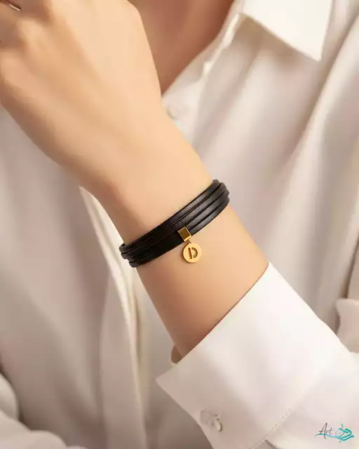 دستبند چرم و طلا حروف D