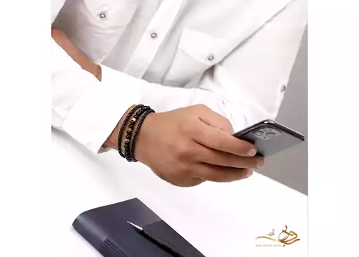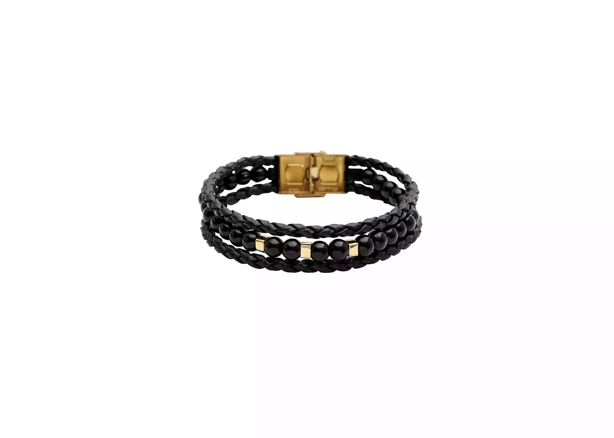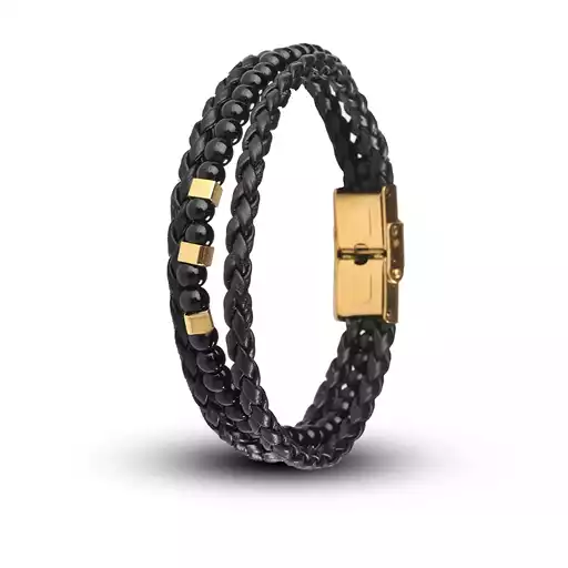 - دستبند بافت چرم و سنگ اونیکس و مکعب طلا