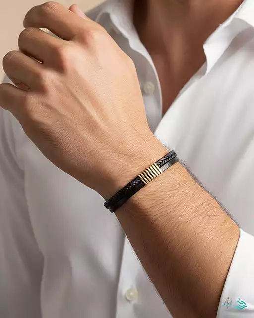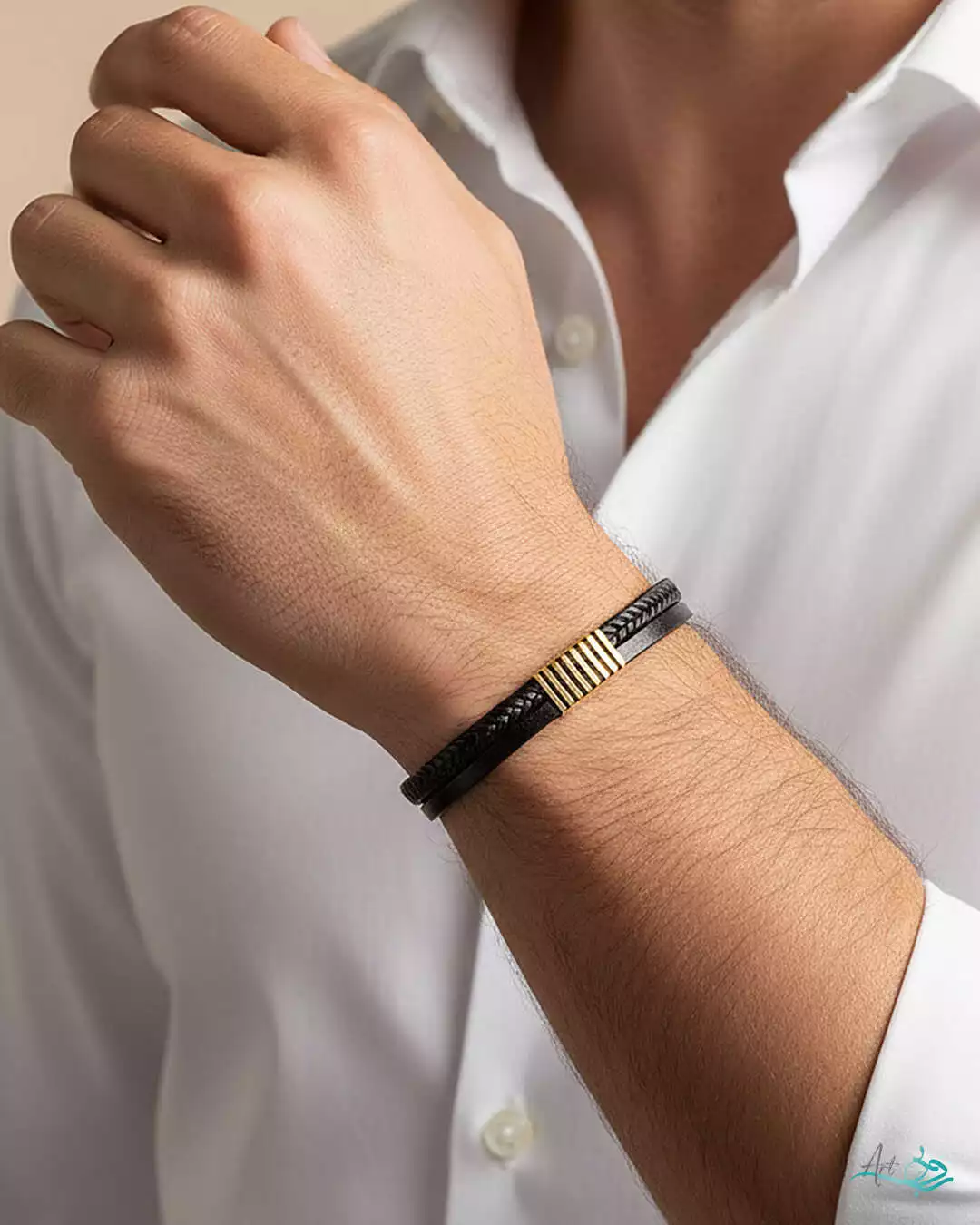 - دستبند چرم طبیعی و خطوط موازی طلا