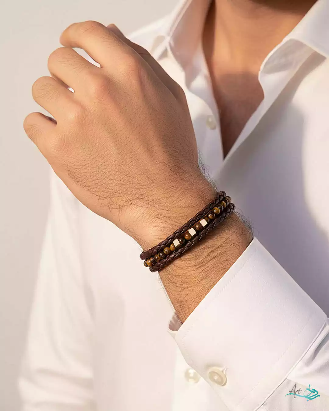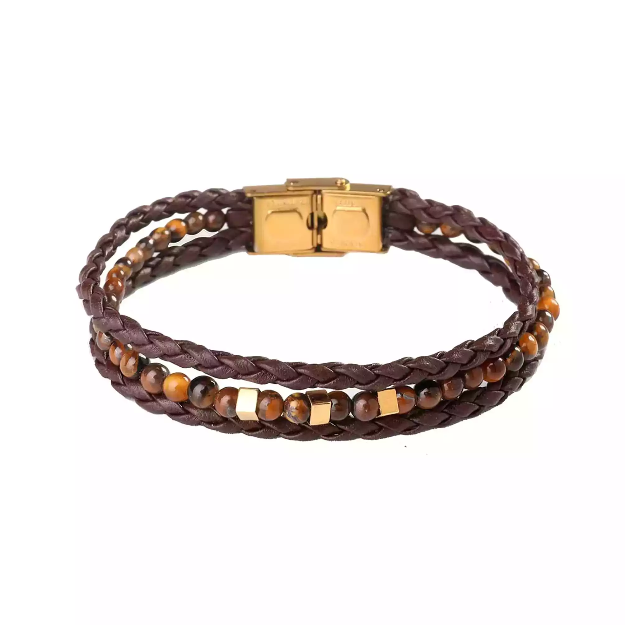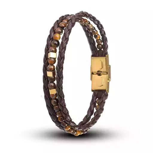 دستبند بافت چرم و سنگ چشم ببر و طلا مردانه