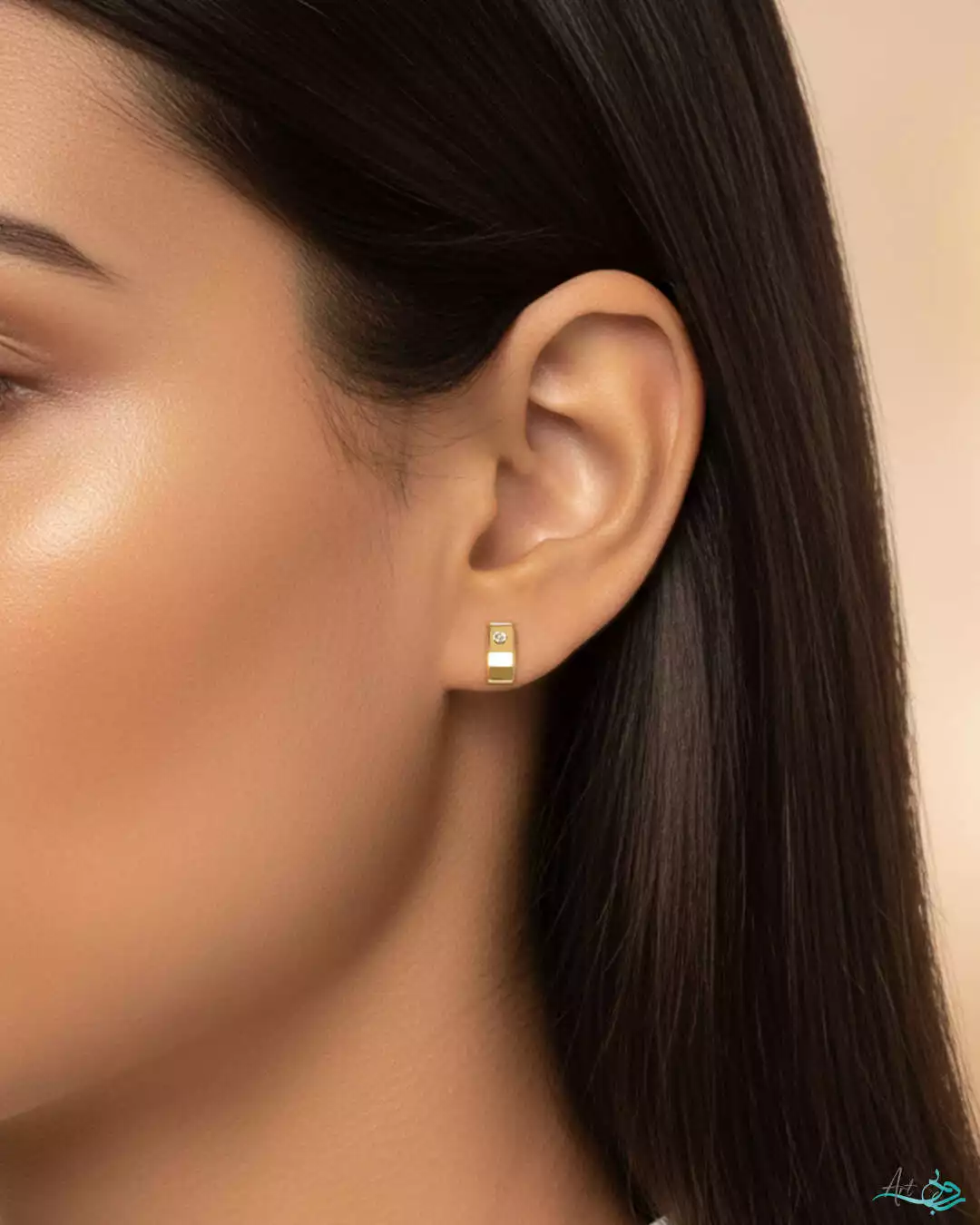 - سنگ سیزی سفید: نگین کوچک و درخشان این گوشواره از جنس سیزی سفید است که با ظرافت در گوشهای از فرم مقعر مستطیل شکل قرار گرفته و نوری خیرهکننده را منعکس میکند.